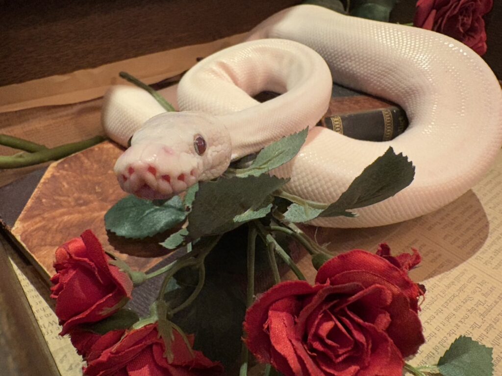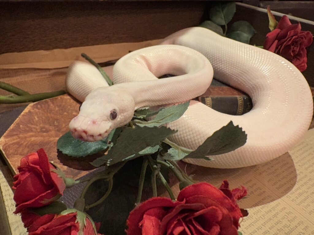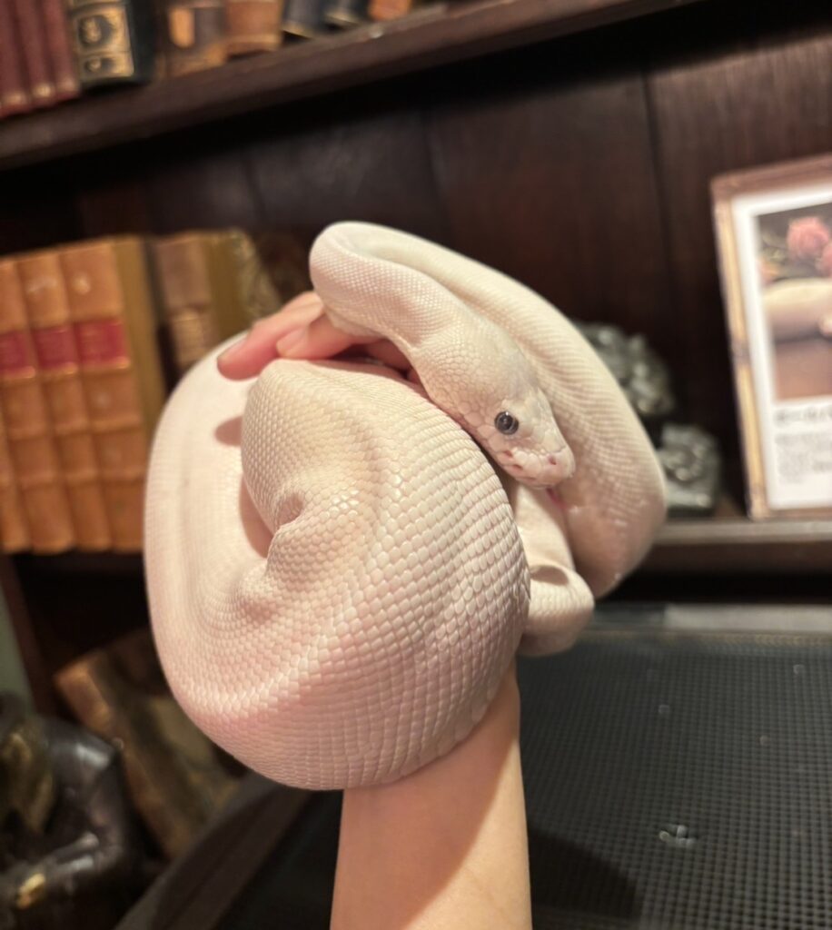 ボールパイソンは学習能力が限定的で、感情表現や意思疎通の方法も人間とは全く違います。なので犬や猫のようなしつけが基本的に出来ない生き物です。しかし落ち着かせることは十分可能です。定期的なハンドリングや、給餌リズム(「この曜日は餌の日」と覚えさせること)で、嚙まなくなりストレスにも強くなります。